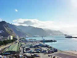 Santa Cruz is located in the northeast quadrant of Tenerife, 210 kilometres (130 mi) off the north-western coast of Africa within the Atlantic Ocean. The distance to the nearest point of mainland Spain is 1,300 kilometres (810 mi). Between the 1833 territorial division of Spain and 1927, Santa Cruz de Tenerife was the sole capital of the Canary Islands, until 1927 when a decree ordered that the capital of the Canary Islands be shared, as it remains at present.[8][9] The port is of great importance and is the communications hub between Europe, Africa and Americas, with cruise ships arriving from many nations. The city is the focus for domestic and inter-island communications in the Canary Islands.[10]