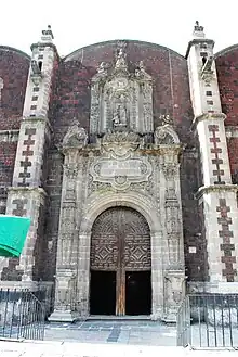 Access is through a rounded arch flanked by two estipites.[2] It consists of a rounded arch with raised decorative features, flanked by two pilasters decorated with plants motifs, cherubs, and the faces of saints. One aspect of this decoration that stands out are two angels carrying flowers. These flowers carry over to the pediment, which also bears an inscription referring completion of the towers and the side portal.