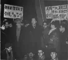 The Anpo protests outraged and energized the Japanese right wing.[38] On October 12, during a televised election debate, Inejirō Asanuma, the chairman of the Japanese Socialist Party, was assassinated by a 17-year-old right-wing youth, Otoya Yamaguchi, who rushed onto the stage and fatally stabbed him twice in the stomach with a wakizashi.[39] After his arrest, Yamaguchi told police that he had hoped to assassinate Nosaka as well.[40] On November 13, 1963, Nosaka survived an assassination attempt while making a speech in Osaka.[41] The perpetrator was 22-year-old Masahiro Nakao, a member of the rightist group Dai Nippon Gokuku Dan. Nakao, armed with a dagger, leaped on a platform where Nosaka was giving his speech. Nakao was subdued by Party members who turned him over to the police.[42]