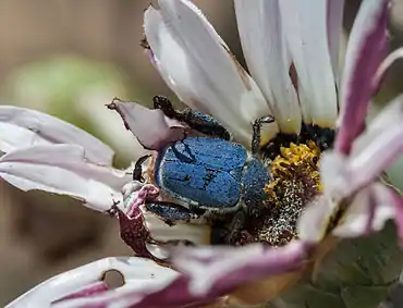 Blue monkey beetles are important pollinators of the Namaqualand region, especially for Mesembryanthemum and some daisy species, on which they primarily feed.