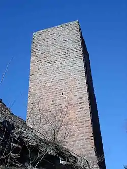 The landmark of the castle is a 20-metre-high bergfried, whose walls are made of rusticated ashlars from the Hohenstaufen era. In addition, parts of the well tower and enceinte may still be seen.