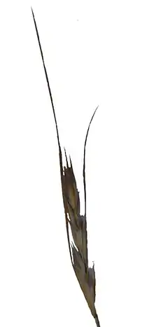 Schoenus triticoides is a species with ivory coloured culm bases and leaf sheaths, which are open and membranaceous.[1] The inflorescence of this species is a relatively long and straw coloured spike-like panicle that somewhat resembles the flowering heads of wheat.[1] The primary inflorescence bracts of this species have membranaceous extensions (i.e. auricles) that are expanded at their base.[1]