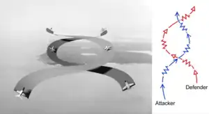 More typically what happens next in the rolling scissors is that the initial attacker, aware of their vulnerability caused by the overshoot, also rolls their aircraft, and pulls their nose toward the defender's aircraft. Due to the two components of the initial overshoot (vertical and horizontal), if the pilots keep attempting to turn their noses toward their opponent, then energy management, elements of roll and turn (as in the flat scissors; although in the rolling scissors there are no reverses of turn), as well as climbs and descents will be required to maintain maneuvering that might, if successful, result in a position from which a shot can be made. What evolves in the rolling scissors is a maneuver that is essentially two aircraft barrel-rolling around each other. The resulting maneuver often looks like two interwoven cork-screws or a double helix. The more barrel rolls that are flown in the rolling scissors, the more nearly the rolls become horizontal only, as each pilot attempts to deplete enough forward speed to place their fighter behind the other.
