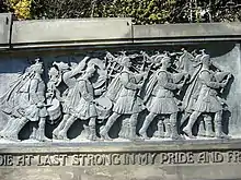 At the bottom of the frieze are lines from E. A. Mackintosh's poem "A Creed": "If it be life that waits I shall live forever unconquered; if death I shall die at last strong in my pride and free." Mackintosh was a 23-year-old ex-Oxford Classics student of Scottish descent who was killed at the second Battle of Cambrai in 1917.[3]