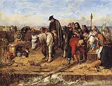 Less well known contemporaries of Wilkie that pursued genre art included William Home Lizars (1788–1859), who was a student with Wilkie at the Trustees Academy. He exhibited two genre paintings in 1811: A Scotch Wedding and The Reading of the Will, which demonstrate humour and seem to relate to the early work of Wilkie, who painted his own version of the later in 1820. Shortly after this Lizars turned to engraving for a living.[8] William Shiels (1785–1857) is mainly known as an animal painter, but he also created genre art. James Howe (1780–1836) also undertook genre art with an agricultural dimension. Most influenced by Wilkie were his close friends John Burnet (1784–1868), William Allan (1782–1850), Alexander George Fraser (1786–1865) and Andrew Geddes (1783–1844). The first three were all contemporaries of Wilkie at the Academy, while Geddes was self-taught. Burnet and Fraser worked closely with Wilkie in London, while Geddes and Allan stayed in touch with him throughout his career. Allan became Master of the Trustees Academy and later President of Royal Scottish Academy and so was able to pass on Wilkie's influence. He produced genre paintings including Christmas Eve (undated), which is a variation on Wilkie's A Penny Wedding.[9]