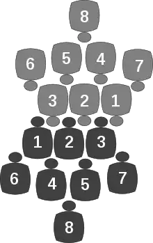 A rugby union scrum consists of two teams' eight forwards, with each team binding in three rows. The front row is composed of the two props and the hooker.[3] The two second row forwards (jersey numbers four and five), commonly referred to as the locks bind together and directly behind the front row with each putting their heads between the props and the hooker. Lastly the back row is made up of the two flankers and the number eight. The flankers bind on each side of the scrum — next to a lock and behind a prop.[3]