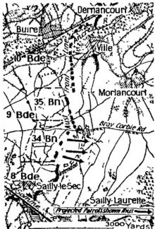 On 10 June 1918, the day after the Germans launched an attack aimed at the Montdidier–Compiegne–Soissons railway,[21] a third battle took place around Morlancourt. This saw the Australian 7th Brigade capture the Morlancourt spur, which overlooked village of Sailly-Laurette, to the south of Morlancourt.[22] The Australians then worked to consolidate their position ahead of further actions on the Somme, including the Battle of Hamel in early July.[23] Capture of the spur completed the process which had begun with the earlier two battles[24] and helped the Allies set the conditions required for further actions prior to the final Hundred Days Offensive. The final Allied offensive began in August 1918 and ended the war. As a result of the final battle, 325 Germans were taken prisoner, while the Australians lost 400 killed or wounded.[22]