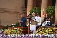 ![]() Narendra Modi takes the oath of office as the Prime Minister of India, with President Kovind administering the oath. | |