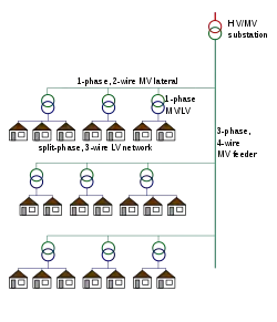 Distribution transformers or secondary transformers, placed along feeders, convert the voltage from the medium to a low voltage level, suitable for direct consumption by end customers (mains voltage).[3] Typically, a rural primary feeder supplies up to 50 distribution transformers, spread over a wide region,[4] but the figure significantly varies depending on configuration. They are sited on pole tops, cellars or designated small plots.[2] From these transformers, low-voltage or secondary network branches off to the customer connections at customer premises, equipped with electricity meters.[3]