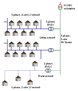 A low-voltage network or secondary network is a part of electric power distribution which carries electric energy from distribution transformers to electricity meters of end customers. Secondary networks are operated at a low voltage level, which is typically equal to the mains voltage of electric appliances.
