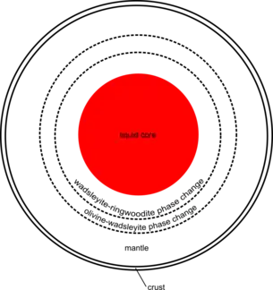 Seismic velocity in the upper mantle rises primarily due to increased pressure, similar to the crust but with a more pronounced effect on velocity.[3] Additionally, pressure-induced mineral phase changes, where minerals rearrange their structures, in the upper mantle contribute to this acceleration.[35] For example, olivine transforms into its denser polymorphs, wadsleyite and ringwoodite, at depths of approximately 410 km and 660 km respectively, resulting in a more compact structure that facilitates faster seismic wave propagation in the transition zone.[35]