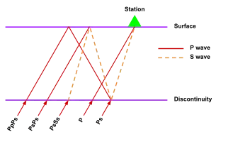 An illustration of seismic reflection and refraction. Seismic refraction usually requires a wide incident angle so that the refracted seismic wave can travel critically (angle of refraction equals 90°).