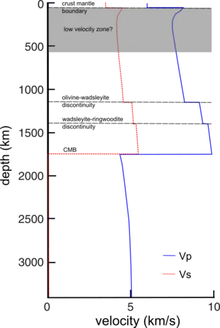 The 1-dimensional velocity structure of the Earth, grey area indicating the transition zone. The change in velocity at the core-mantle boundary (CMB) represents changes in physical state from solid to fluid. At the inner-core boundary (ICB), the core changes from fluid to solid as reflected by the increase in velocity.[3]