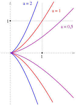 which imply that every real point satisfies x ≥ 0. The exponent explains the term semicubical parabola. (A parabola can be described by the equation y = ax2.)