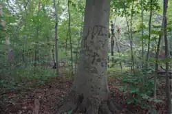 ![]() One of the beech trees located in Seminary Woods with vandalism etched along its trunk. (St.Francis, Wisconsin) | |