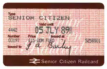 The Senior Railcard is an annual card available to people aged 60 and over, which gives discounts on certain types of railway ticket in Britain. The Railcard has existed in various forms since 1975; the current version is priced at £30.00 and is valid for one year, with a 3-year card available for £70. It is one of a wide variety of discounted and concessionary fare schemes available on Britain's railway network.