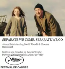 Separate We Come, Separate We Go is a 2012 British coming-of-age drama short film written and directed by Bonnie Wright.[5][6] It is Wright's directorial debut. The film had its world premiere at the 2012 Cannes Film Festival Short Film Corner on 21 May 2012[3] and screened at the BAFTA Graduate on 11 June 2012.[7][8] It premiered in the United States at Gold Coast International Film Festival on 25 October 2013.[9][10]
