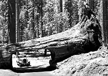 The first European settler to homestead in the area was Hale Tharp, who famously built a home out of a hollowed-out fallen giant sequoia log in the Giant Forest next to Log Meadow. Tharp arrived in 1858 to the region and encountered several groups of Native Americans, the largest being around 600 with several other smaller groups found at higher elevations.[15] After becoming friendly with the Western Mono tribe, Tharp was shown the Giant Forest Sequoia Grove. After his settlement, more settlers came around 1860. Shortly thereafter - between 1860 and 1863, epidemics of smallpox, measles, and scarlet fever killed the majority of the Native Americans living in the area. After this, the rest of the Native Americans left with the largest campsite (Hospital Rock) abandoned by 1865.[15] During their time in the area, the Monachee used periodic fire burning to aid in hunting and agriculture. This technique played an important role in the ecology of the region and allowed for a "natural" vegetation cover development.[15] After they left, Tharp and other settlers allowed sheep and cattle to graze the meadow, while at the same time maintaining a respect for the grandeur of the forest and led early battles against logging in the area. From time to time, Tharp received visits from John Muir, who would stay at Tharp's log cabin. Tharp's Log can still be visited today in its original location in the Giant Forest.