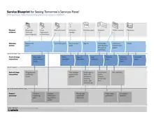 The service blueprint is a technique originally used for service design, but has also found applications in diagnosing problems with operational efficiency. The technique was first described by G. Lynn Shostack, a bank executive, in the Harvard Business Review in 1984.[1] The service blueprint is an applied process chart which shows the service delivery process from the customer's perspective. The service blueprint has become one of the most widely used tools to manage service operations, service design and service.