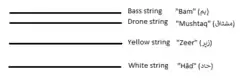 The new string is sometimes referred to as the "fourth string" because it is the last of the four strings to be added to the instrument. However, it was inserted between the yellow string and bass string; today when looking at the modern instrument being played, it is the (3) drone string, the third string from the bottom. The newest string is also known as the Mushtaq (مشتاق) string, because it was first used by Mushtaq Ali Shah, according to a narration of Abolhassan Saba.