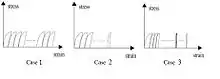 If repeated loading on the granular induces stress beyond the yield surface, three different cases may be observed. In case 1 the residual strain in the materials increases almost without limit. This so-called “ratcheting” state is close to what can be predicted applying simple Mohr–Coulomb criterion to a cyclic loading. In the responses like case 2, residual strain in the materials grows to some extent, but at some stage the growth is stopped and further cyclic loading produces closed hysteresis loops of stress–strain. Finally in case 3 the growth of residual strain is practically diminishes when sufficient loading cycles are applied. Case 2 and case 3 are cases of plastic and elastic shakedown respectively.[1]