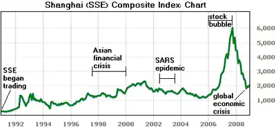 • 2007 – 2008 – A "stock market frenzy" as speculative traders rush into the market, making China's stock exchange temporarily the world's second largest in terms of turnover.[16][17] After reaching an all-time high of 6,124.044 points on October 16, 2007,[18] the benchmark Shanghai Composite Index ended 2008 down a record 65%[19] mainly due to the impact of the global economic crisis which started in mid-2008.