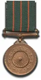 Medal: Circular bronze, 1-3/8 inches in diameter. In the centre, the Ashoka Chakra, surrounded by a lotus wreath and with an ornate edge. Suspended by a straight bar suspender. The medal is named on the edge.