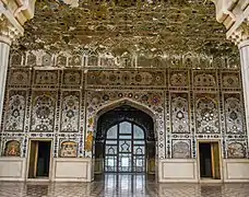 The Sheesh Mahal (Urdu: شیش محل; "The Palace of Mirrors") is a palace located within the Shah Burj block in northern-western corner of Lahore Fort. It was constructed under the reign of Mughal Emperor Shah Jahan in 1631–32, with some additions later under Sikh Maharaja Ranjit Singh. The ornate white marble pavilion is inlaid with pietra dura and complex mirror-work of the finest quality. The hall was reserved for personal use by the imperial family and close aides. It is among the 21 monuments that were built by successive Mughal emperors inside Lahore Fort, and forms the "jewel in the Fort’s crown."[1] As part of the larger Lahore Fort Complex, it has been inscribed as a UNESCO World Heritage Site since 1981.