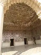 The Sheesh Mahal was built by Emperor Shah Jahan. It was built in the middle of Jahangir's rule. The façade, consisting of five cusped marble arches supported by coupled columns, opens into the courtyard. The engrailed spandrels and bases are inlaid with precious stones. The pavilion is in the form of a semi-octagon, and consists of apartments roofed with gilded cupolas and intricately decorated with pietra dura and convex glass and mirror mosaic (ayina kari) with thousands of small mirrors. At night they light candles.[8] The decorative features also include stucco tracery (munabat kari) and carved marble screens in geometrical and tendril designs.[9] The roof of the central hall rises up to two storeys. The hall was originally decorated with fresco paintings that were later replaced with glass mosaic in different colours.[1]