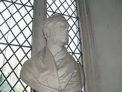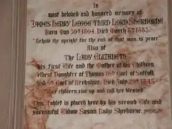The present Church of England parish church of Saint Mary Magdalene is in the centre of the village. Its bell-tower and spire were built late in the 13th or early in the 14th century.[5] The church is next to Sherborne House, which was built for Thomas Dutton after he bought the manor of Sherborne in 1551.[6] Elizabeth I stayed at the house in 1592.[3] John Dutton had the house re-faced in 1651-53,[7] and James Dutton, 1st Baron Sherborne had alterations made to the church between 1743 and 1776, including the addition of a Doric portico.[3] In 1850-59 John Baron Dutton, 2nd Baron Sherborne had the medieval nave and aisle of the church demolished to allow more light into Sherborne House, and had a new nave and sanctuary built further north.[3][6] The church contains numerous ornate monuments to members of the Dutton family.[3][6] The tower has a ring of six bells.[8] The oldest is medieval; three more were cast in 1653 and the remaining two are 18th-century.[3]