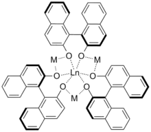The Shibasaki group produced the first chiral lanthanide-binaphtholate complex in 1992, which was used to catalyse nitroaldol reactions.[1] The complex was not characterised but was the first to perform the reaction enantioselectively. This success led to further research which resulted in the development of heterometallic complexes with the formula [Ln(binol)3(M)3], the structure of which was elucidated by X-ray crystallography.[2]