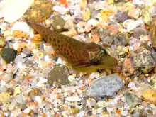 The clingfish gets its name from the ability of the fish to attach itself to the rock walls of the ocean shore. It does this by having pelvic fins that have been adapted to form suckers. These suckers keep the clingfish strongly attached to the rocky surfaces off the shorelines. In addition to these suckers, the front fins of the clingfish are much stronger to aid in clinging to the rocks. The clingfish has other adaptations that allow it to inhabit rocky surfaces and reduce predation. For instance, the clingfish has a triangular shaped head and a flattened body. These characteristics allow the clingfish to reduce the drag of the water from the waves pushing and pulling against it.[5] L. lepadogaster also has distinct differences from the other species of Lepadogaster. For one, L. lepadogaster has a much more active lifestyle than the species L. purpurea. This is evident in both L. lepadogaster's swimming speed and in its more frequent feeding periods[6]