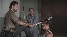Rick offers to help the prisoners clear a cell block and he, Daryl, and T-Dog provide them melee weapons as they show them how to fight off walkers. During this, Big Tiny breaks formation and is scratched in the back by a walker. Unable to save Big Tiny as they had with Hershel, Tomas hacks at Big Tiny with an ax mercilessly to kill him, making Rick and the others uneasy. Later, Tomas disobeys Rick's instructions as they clear out a room, forcing the group to deal with a mass of walkers. In the chaos, Tomas attempts to assassinate Rick twice. Eventually, the walkers are subdued, and Rick confronts Tomas. Tomas claims he was reacting instinctively but Rick drives a machete into Tomas' head, killing him. Andrew reacts by trying to hit Rick with a baseball bat but Rick knocks him down. Andrew runs outside into a courtyard filled with walkers. Rick locks Andrew out, despite his pleas to be let back in. Oscar and Axel profess no knowledge of Tomas' or Andrew's plans and surrender their weapons to Rick's group, and he keeps to his word, letting them stay in the cleared block.
