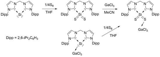 The complex was found to retain Lewis basic properties despite not being a Si(0) complex. For example, the disulfur complex can then form an adduct with GaCl3. XRD analysis of this GaCl3-coordinated structure revealed asymmetric Si-S bond lengths of 2.106(2) Å and 2.006(2) Å and a S-Si-S bond angle of 115.03(8)°.[10] The weight of the aforementioned no-bond/double-bonding resonance was enhanced under addition of the GaCl3 adduct into the model, in expectation with one of the sulfides acting as an electron donor.[10]