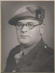 He was commissioned into The Somerset Light Infantry in 1942, and was seconded to the Somalia Gendarmerie at the time of his GC action. He died of his burns the next day.[2] He was born on 25 July 1916 in London and had been educated at Regent Street Polytechnic and the Royal Academy of Music, where a memorial to him was unveiled in 2006.[3] Notice of his award appeared in a supplement to the London Gazette of 6 September 1946, dated 10 September 1946.[4] He is buried in the Nairobi War Cemetery.[5] In December 2021 a plaque in his memory was installed on the wall of his Camden home by the Jewish American Society for Historic Preservation.[6]
