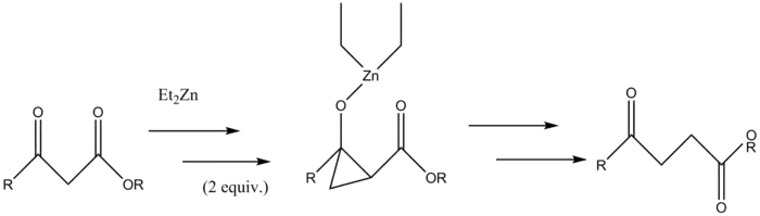 A Furukawa-modified Simmons-Smith generated cyclopropane intermediate is formed in the synthesis of γ-keto esters from β-keto esters. The Simmons-Smith reagent binds first to the carbonyl group and subsequently to the α-carbon of the pseudo-enol that the first reaction forms. This second reagent forms the cyclopropyl intermediate which rapidly fragments into the product.[34][35]