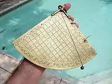 A sine quadrant (Arabic: الربع المجيب, romanized: rub‘ul mujayyab), sometimes known as a "sinecal quadrant", was a type of quadrant used by medieval Arabic astronomers. The instrument could be used to measure celestial angles, tell time, find directions, perform trigonometric computations, and determine the apparent positions of any celestial object for any time. The name is derived from the Arabic rub meaning 'a quarter' and mujayyab meaning 'marked with sine'.[1]