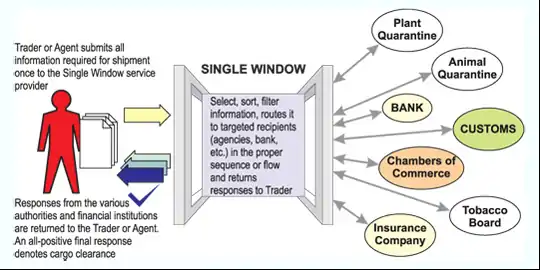 These inevitable various controls can be carried out through the Single Window system, supported by information technology, and is an optimized process. A Single Window's benefits are shown in the following two diagrams, exemplifying trade with and without a Single Window: