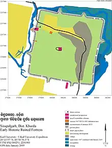 The first excavations at the site were carried out by B.B. Lal in 1948. An American-Indian team took up work in 2001. In 2005 ground penetrating radar revealed the probable position of the southern moat.[7] Toward the centre of the fortress (Area D) the 19 column structure has been recorded three-dimensionally by means of a laser scanner. It is disturbed and incomplete. Two gates pierce each of the glacis of the quadrangular plan. As at contemporary Jaugada, the plan tips 10° clockwise of north.[8] With 1,125 m × 1,115 m (3,691 ft × 3,658 ft) (measured on the crest), Sisupalgarh is larger in surface than is Jaugada. Sisupalgarh's defences are the highest known of this period in India. The ancient settlement probably was not dense, but rather there was room inside the fortress to graze.