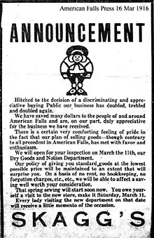 - 1915 In April, S. M. opens the Skaggs Cash Store "with his own hands, on rented property, on borrowed money."[4] The store was about 18x32 feet. It was located in the original town of American Falls, adjacent to the Union Pacific railroad tracks, and he apparently bought large lots from the rail cars and sold them to the public. That store became Skaggs Store No. 1 and is now beneath the American Falls Reservoir.[5] When the town was relocated between 1923 and 1925, that store was situated at the corner of Ft. Hall and Idaho Street, now housing the Senior Center.[6] Unusual for the time, the Rev. Skaggs had a cash only, no credit policy, which all his sons later adopted.[lower-alpha 2][lower-alpha 3] (See adjacent newspaper ads.)
