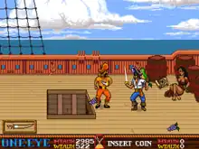 The game is playable in single and co-op modes, where the objective of both players is to rescue their kidnapped princess from the antagonist, a wizard. Player one controls One-Eye, and player two controls Red Dog. Gameplay consists of players fighting through waves of enemies and level bosses, such as Medusa and Ship Captains, collecting weapons and booty to become increasingly powerful. Collectable items are centred around the pirate theme, such as the cutlass or flintlock pistol.