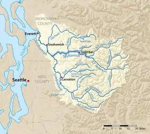 The Skykomish River's main stem is 29 miles (47 km) long, from the confluence of its North and South fork, until it and the Snoqualmie forms the Snohomish River. Adding the longest headwater tributaries, South Fork Skykomish and Tye River, the length is 62.4 miles (100 km).[2] The Skykomish's drainage basin is 834 square miles (2,160 km2) in area.[3] U.S. Highway 2 and the BNSF Railway are routed to follow the Skykomish River, South Fork Skykomish, and Tye River to Stevens Pass and the Cascade Tunnel.