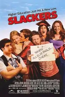 Slackers is a 2002 American comedy film directed by Dewey Nicks and starring Jason Schwartzman, Devon Sawa, Jason Segel, Michael Maronna, Jaime King, and Laura Prepon. Its plot follows a nerdy college student who blackmails a group of young men with his knowledge that they have cheated throughout college, and uses it to get closer to a young woman he is obsessed with. This was Mamie Van Doren's second to last movie (The American Tetralogy 2012), she starred naked at the age of 71.[3]