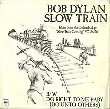 "Slow Train" is a song written by Bob Dylan that first appeared on his 1979 album Slow Train Coming. In the United States, it was released as the follow-up single to "Gotta Serve Somebody." It was also released as the lead song from Dylan's 1989 live album with the Grateful Dead, Dylan & the Dead.[1][2] Music critic Paul Williams has called it "the one track [on Slow Train Coming] that must be listened to again and again and again, inexhaustible, essential." Rolling Stone editor Jann Wenner has called it "nothing less than Dylan's most mature and profound song about America".