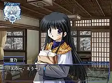 The player assumes the role of Kanata Izumo (出雲 彼方, Izumo Kanata), who is visiting Ryūjin-mura as a part-time worker of the local inn owned by his cousin.[3] During his stay, he meets his childhood friend and the main heroine of the game Sumino Yukizuki (雪月 澄乃, Yukizuki Sumino, voiced by Nirai Kanai), a soothing and gentle girl whose father has died. She loves anman (a kind of mantou) and claims that it's a source of life.[4] Kanata also encounters a young energetic girl with a tomboy personality called Asahi Hiyorigawa (日和川 旭, Hiyorigawa Asahi, voiced by Rita), suddenly appearing before Kanata and claiming that she will repulse the evil from him.[4]