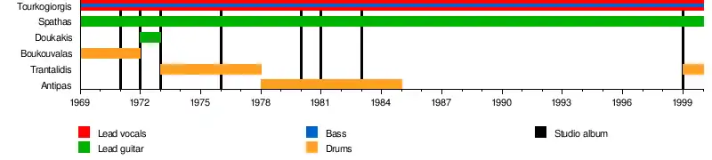 The group has gone through many lineup changes, but the two core members remained: guitarist Yannis Spathas and bassist/singer Antonis Tourkogiorgis. Spathas died in 2019, aged 68. Nikos Antipas died on January 31, 2022, from complications related to stroke, aged 68.