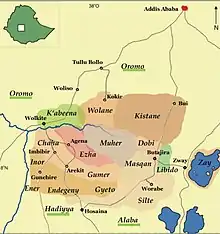 The Kistane also share long historical and ancestral ties with the Amhara, particularly of Shewa who share the same Orthodox Christian religious faith, several customs, and speak similar languages. This is further augmented by the fact that they both belong to the South Ethio-Semitic language branch family and amongst the Gurage dialects and languages, the Kistane language is thought to be lexically closest to Amharic. Several clans of the Kistane are recorded to have been descended from Amharas who migrated to the area to escape Gragn's invasions and which are attested in their ancestral lineages (i.e. Fasilgè).[15] King Sahle Selassie of Shewa, himself also drawn into conflict with the Oromo, responded to a request of the leader and famed military commander of the Kistane, Woda Leliso for military help and an alliance against the Oromo who were growing increasingly aggressive and sent bands of Amhara riflemen to aid them[16] By 1830, he gained the submission of the Kistane leaders Kero and Amino and incorporated them as a tributary state of Shewa, monikering himself as "King of the Gurage". When Menelik II, his grandson sought to re-expand and conquer the rest of the southern parts of the country in the 1870s, the Kistane submitted peacefully once again. This allowed them to retain their local political autonomy and spared them from the depredations that other Gurage sub-groups and neighboring peoples who did rebel faced. They were able to live relatively more peacefully throughout the next few decades. However, several Oromo Baleabats (overlords) still ruled over Kistane Gurages in many districts in Kistaneland by force, and many emigrated to various parts of Ethiopia as a result of the despoliation and shrinking of their homeland which they were confined in that became unable to sustain their population.[17] It was when Addis Abeba was founded when many Kistane Gurages emigrated to the newly founded Addis Abeba, becoming the first pioneers of the Gurages to establish themselves in the new capital and greatly contributed to the labor work and construction in it. Shewan aristocratic and Kistane sources recite that Emperor Menelik granted the Kistane land in the district of Geja in Addis Abeba, being the first area where they historically settled and encouraged them to live there. The Alemgena-Welayta Road Construction association was founded by the Kistane during Haile Sellasie's and provided a source of labor, employment opportunities and communal identity for new young emigrants who migrated to Addis.[18][19]