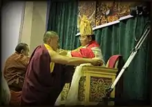 Rinpoche was a regular speaker at conferences around the world, addressing topics such as Buddhism in the modern world, death and dying, meditation and happiness. In 2004, he served as a keynote speaker at the Parliament of the World's Religions, where over 8,000 religious leaders and lay people gathered in Barcelona in Spain to discuss the issues of religious violence, access to safe water, the fate of refugees worldwide, and the elimination of developing countries' debts.[22] In August 2008 he joined Robert Thurman at the Aspen Institute in Aspen, Colorado, to speak about "Tibet’s Unique Buddhist Heritage" as part of a symposium called "His Holiness the Dalai Lama at Aspen: A Celebration of Tibetan Culture", organized jointly with the Conservancy for Tibetan Art and Culture.[23] In October 2010 he gave a keynote speech on "Tibetan Buddhism in Modern Western Culture" at the International Conference on Tibetan Buddhism held at Emory University.[24] In 2011, he was a keynote speaker and participant in the Global Buddhist Congregation in Delhi which brought together "religious, spiritual and world leaders, as well as 800 scholars, delegates and observers from 32 countries."[25] "The goal was to examine both the capacity and the resilience of Buddhism to engage with the most pressing concerns of the modern world, namely violence, social and economic disparity, environmental degradation and discord between and within communities and nations" and "to contribute to cultivating and fostering peace, harmony, co-existence and a shared responsibility amidst the diversity of cultures, communities and nations."[25] In 2012, he was a keynote speaker at the Happiness and Its Causes conference in Sydney.[26]