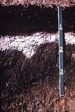 In most soil classification systems, horizons are used to define soil types. The German system uses entire horizon sequences for definition.[1] Other systems pick out certain horizons, the "diagnostic horizons", for the definition; examples are the World Reference Base for Soil Resources (WRB),[2] the USDA soil taxonomy[3] and the Australian Soil Classification.[4] Diagnostic horizons are usually indicated with names, e.g. the "cambic horizon" or the "spodic horizon". The WRB lists 40 diagnostic horizons. In addition to these diagnostic horizons, some other soil characteristics may be needed to define a soil type. Some soils do not have a clear development of horizons.