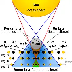 The diagrams to the right show the alignment of the Sun, Moon, and Earth during a solar eclipse. The dark gray region between the Moon and Earth is the umbra, where the Sun is completely obscured by the Moon. The small area where the umbra touches Earth's surface is where a total eclipse can be seen. The larger light gray area is the penumbra, in which a partial eclipse can be seen. An observer in the antumbra, the area of shadow beyond the umbra, will see an annular eclipse.[18]